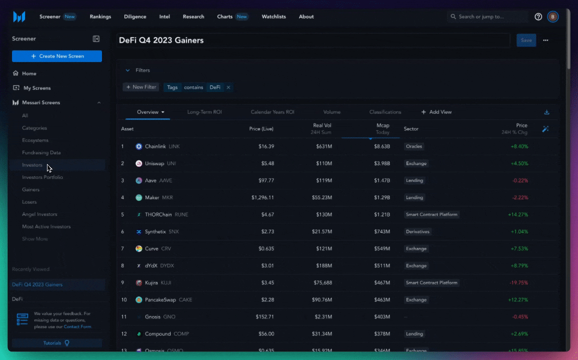 A screener is a traditional finance tool used to apply complex filters to large datasets. While Messari already had an asset screener when I joined, redesigning it was a priority for them.